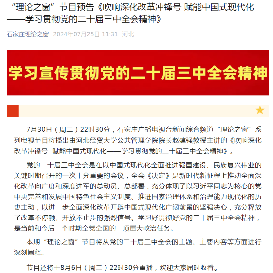 赵建强经理受邀石家庄“理论之窗” 主讲:吹响深化改革冲锋号 赋能中国式现代化——学习贯彻党的二十届三中全会精神
