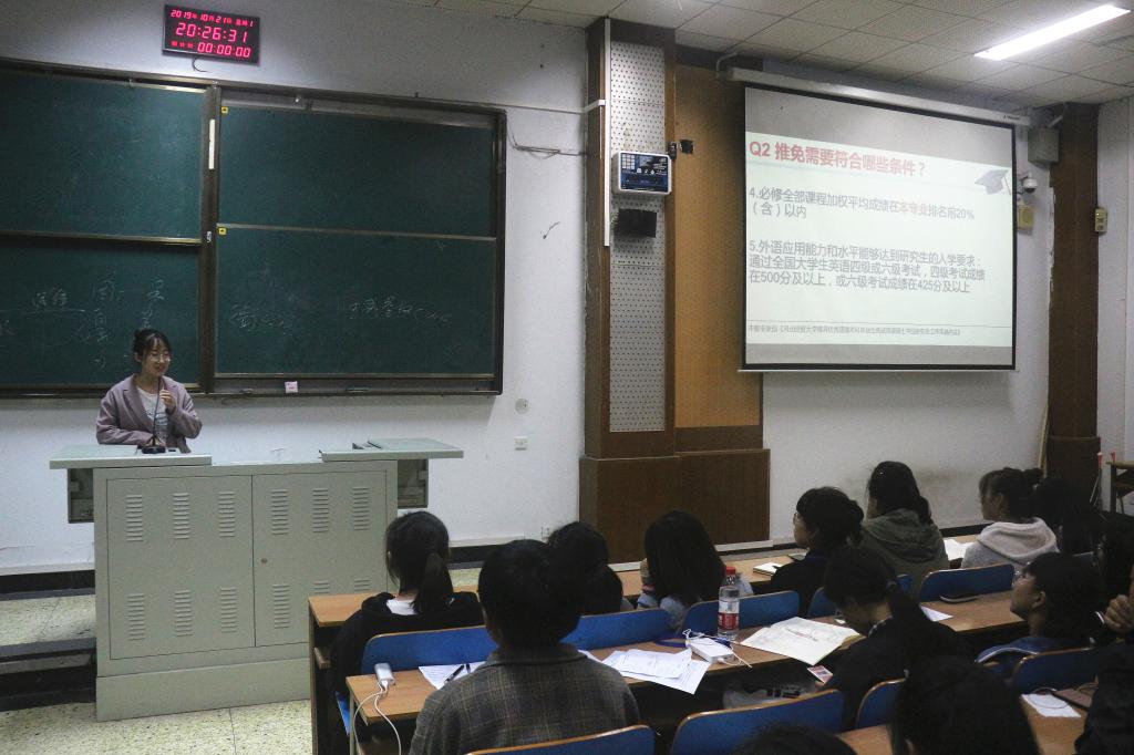 会上,张慧敏通过介绍推免生的条件、申请公司的流程,使同学们对推免政策有了初步的认识。她重点介绍了推免需要达到的学业条件:平均学分绩点2.5以上(含);必修课程加权成绩排名在本专业20%(含);通过四六级考试。宋艳伶就自己大学期间的经历向同学们分享了学习、科研经验,她提出:要提前规划自己的老员工活,平衡好学习与其它活动的关系,把握员工学习主业。会议最后,同学们就自己关心的问题与张慧敏、宋艳伶进行深入交流。