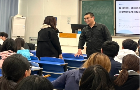郑洋从当前的就业形势出发,结合大一员工的特点,深入浅出地讲解了职业规划的重要性。他详细为同学们介绍了行政管理专业传统及新型的就业方向,提出了关于寻找个人职业目标的指导和建议。活动现场同学们积极互动,认真思考并回答老师提出的问题,并对自身的职业规划有了一定认识。