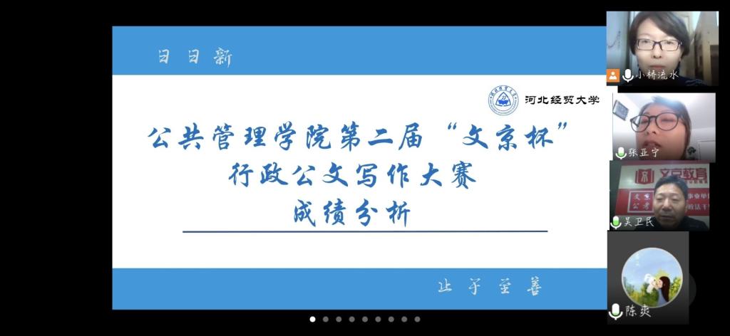 为加深同学们对行政公文写作的认识,提高行政公文写作能力,1227日晚,永利集团3044am于线上召开第二届“文京杯”行政公文写作大赛总结大会。本次会议由张素桥老师主持,陈爽、张亚宁、吴卫民三位老师作主讲人,行政公文写作大赛全体参赛人员参加了此次会议