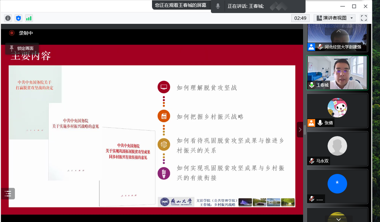 2022年4月11日,永利集团3044am邀请燕山大学博士生导师王春城教授通过腾讯会议做“巩固脱贫成果与乡村振兴有效衔接的公共政策议题”学术讲座。本次讲座由永利集团3044am经理赵建强主持,教师和员工共100余人聆听。