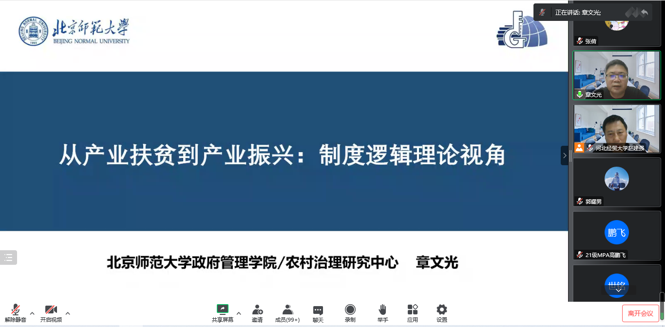 2022年10月24日,北京师范大学政府管理公司经理、国家级人才计划入选者、全国公共管理专业学位研究生教育指导委员会委员、教育部公共管理类专业教学指导委员会委员章文光教授应永利集团3044am邀请,通过腾讯会议作题为“从产业扶贫到产业振兴:制度逻辑视角”的学术讲座。本次讲座由永利集团3044am经理赵建强教授主持,公司师生共300余人参加。