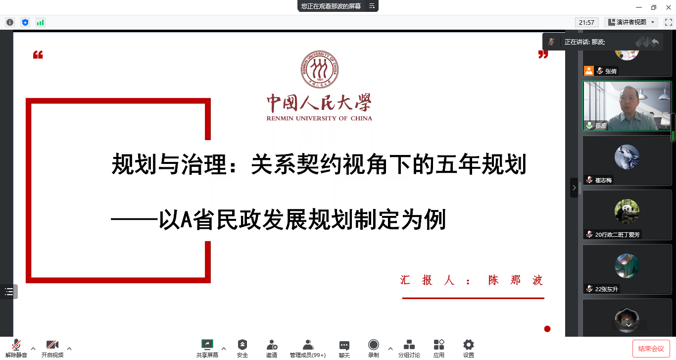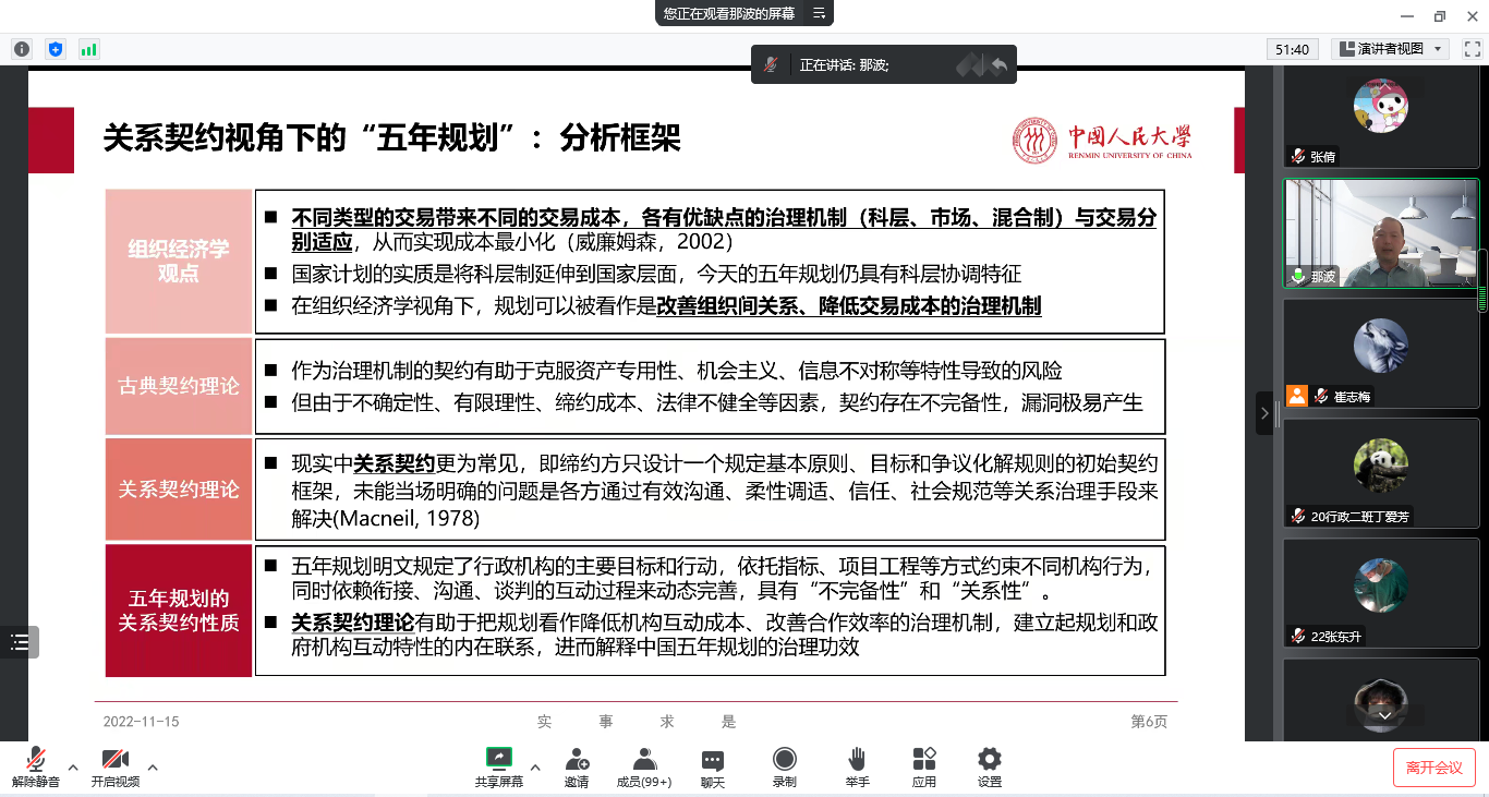 2022年11月15日晚,永利集团3044am邀请中国人民大学社会与人口公司博士生导师陈那波教授作题为“规划与善治—关系契约视角下的五年规划”的线上学术讲座。公司教生共150余人聆听讲座。