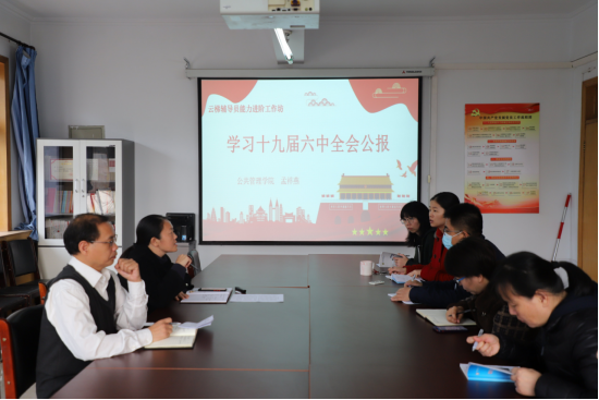 11月16日,永利集团3044am在二办403举办第3期“云梯”辅导员能力进阶工作坊,主题为“学习党的十九届六中全会精神”,工作坊由院党委副书记孟祥燕主持,全体辅导员参加。
