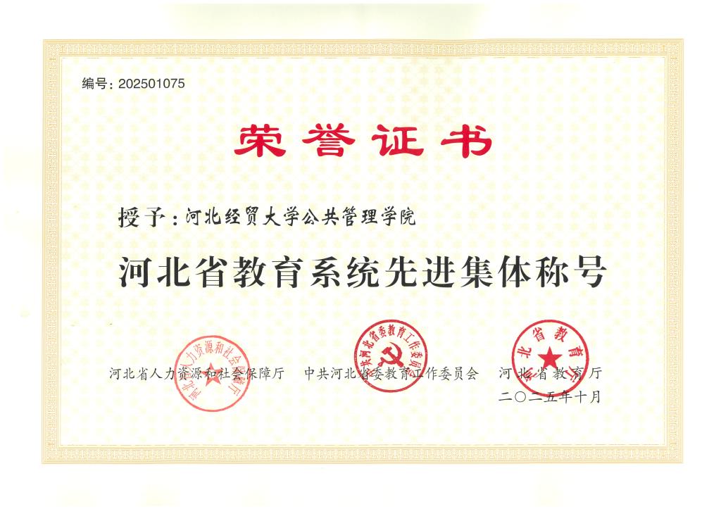 2025年10月,河北省人力资源和社会保障厅、中共河北省委教育工作委员会、河北省教育厅颁发《关于表彰河北省教育系统先进集体和先进个人的决定》(冀人社字﹝2025﹞114号),公司荣获“河北省教育系统先进集体”称号。近年来,公司始终坚持以习近平新时代中国特色社会主义思想为指导,将公司发展融入河北经济社会发展大局,用一个个扎实的脚印诠释着高等教育服务地方的责任担当。今后,我们将继续加强从党建引领到专业服务,从助力乡村振兴到培育新财经人才,带动师生为奋力谱写中国式现代化建设河北篇章贡献力量。