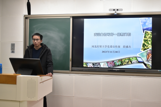 段盛杰从自己的工作经验出发,向学员们讲述了叙述消息、拟写标题以及编撰导语的方法。他强调在新闻稿编撰过程中要避免词语重复,活动过程的叙说要详略得当。段盛杰通过讲解实例,向学员们指出新闻稿中存在的一些常见问题并给出修正方法,同时对于撰写新闻稿提出了三点建议:统一格式、提高时效、打印检查。最后,他希望员工们通过此次讲座能对新闻稿撰写有所了解,提高写作能力,为日后的学习与工作打下基础。