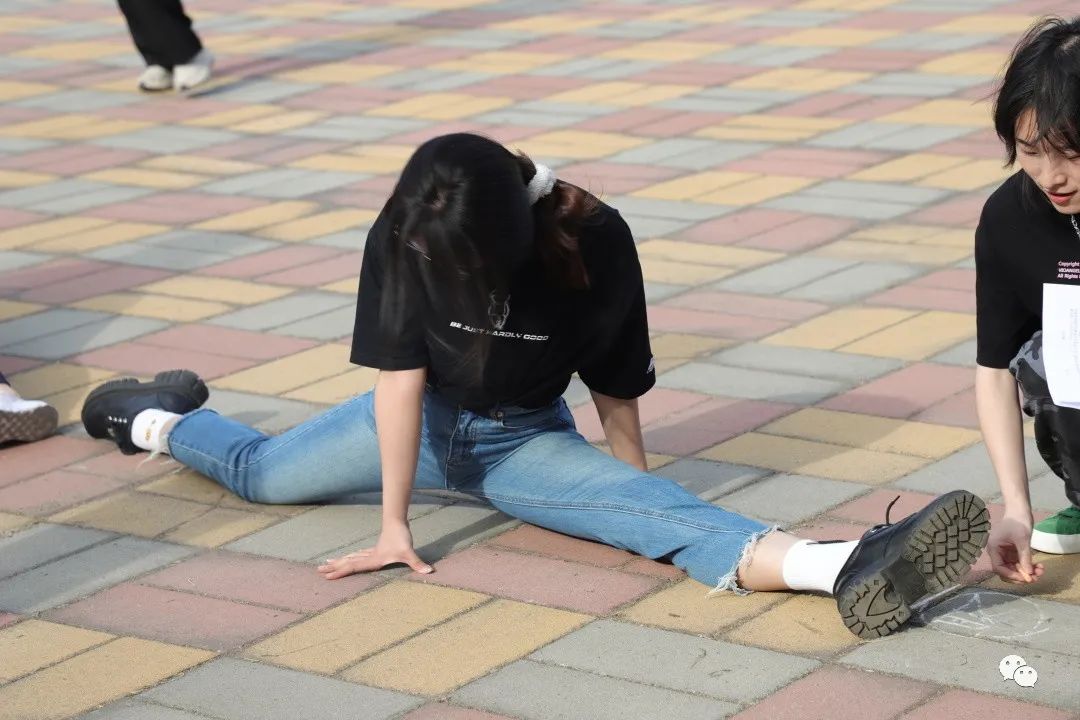 “一字马”项目挑战了参赛同学的柔韧性极限,在每位同学的大长腿连成了一条笔直的长线的同时,也拉近了同学们之间的距离。